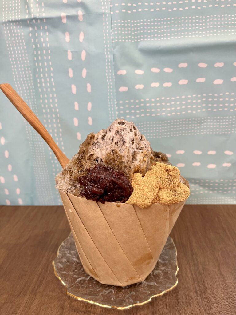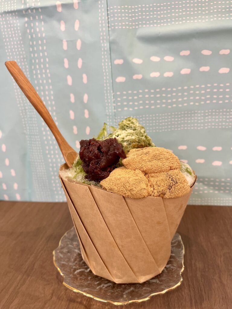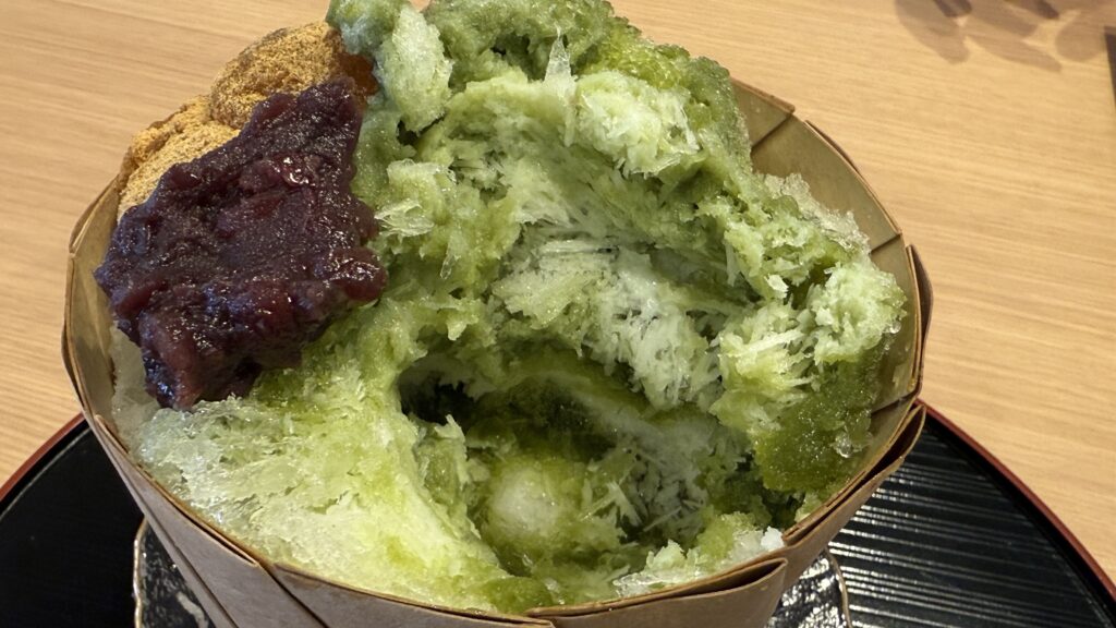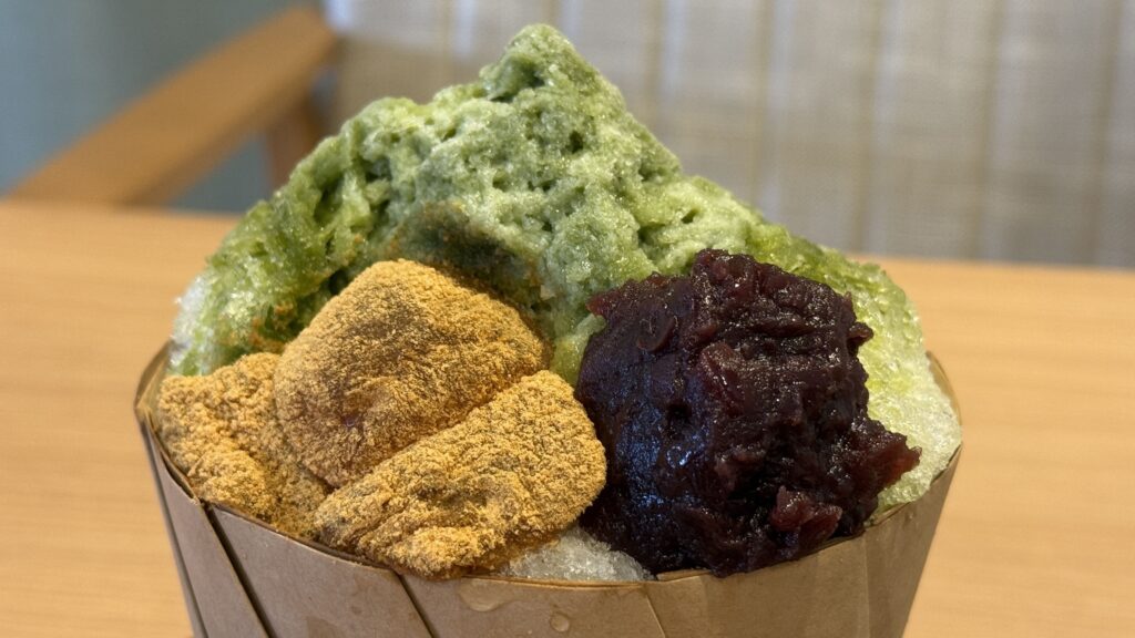 今回は看板フレーバーのかぶせ茶のレギュラーサイズを注文すると、もりもりのかき氷の山にわらび餅3個と粒あんがトッピングされて登場しました。