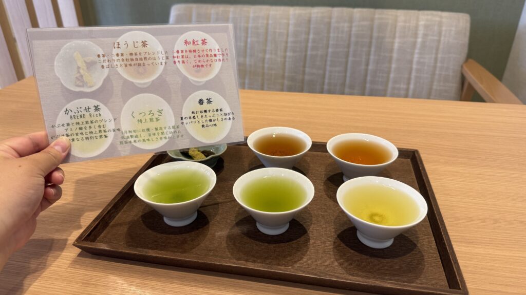 ほうじ茶・和紅茶・かぶせ茶・くつろぎ(特上煎茶)・番茶という、自家農園の個性豊かな茶葉5種をいただけます。