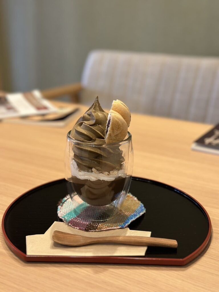 高さのあるグラスに、大内山牛乳を使った濃厚ソフトクリームをベースに、自家製の緑茶クッキー・緑茶フローズン・わらびもち・粒あんなどがたっぷりと入っています。