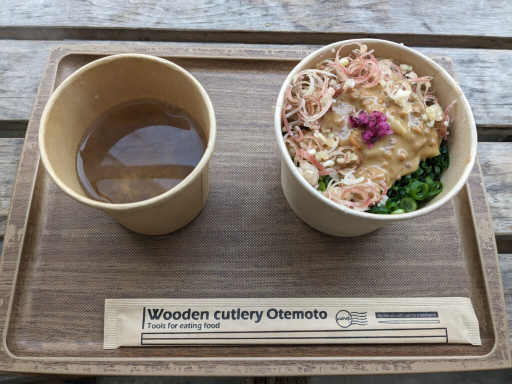 お店の看板メニューである「生かつお節TKG(たまごかけご飯)」をセットにできる「かつおぶしと醤油のらぁ麺」を注文しました。