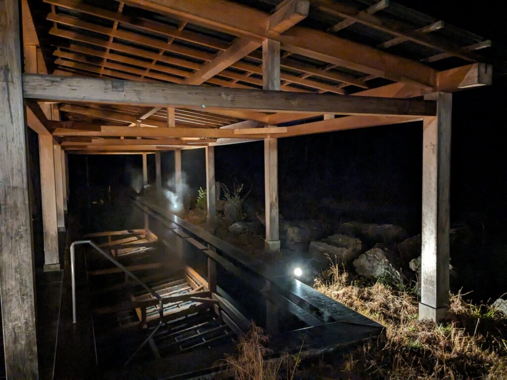 お風呂場は天井が高く空間が広々としており、ぼんやりとした間接照明の中で薬草の香りに包まれると、心が癒やされていきます。