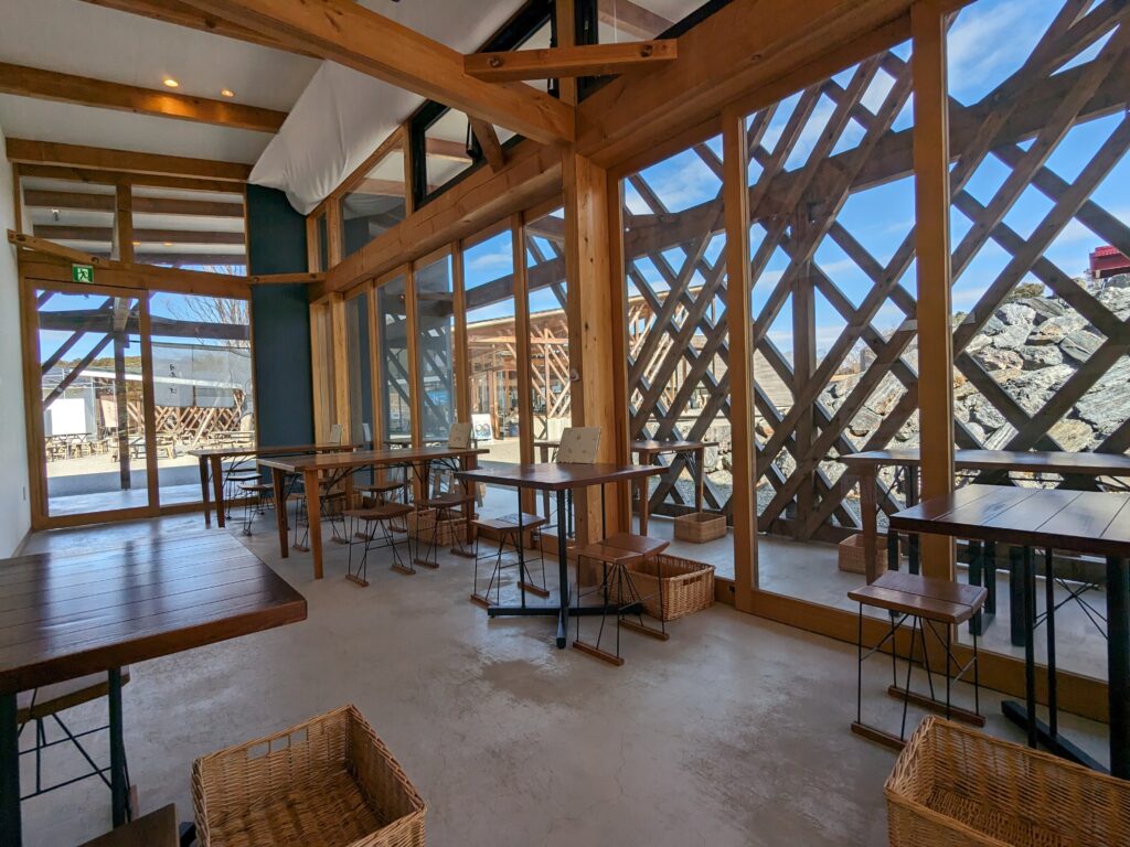 店内に一歩足を踏み入れた瞬間、広々とした空間と開放的な雰囲気に包まれます。大きな窓からは、雄大な山々の景色が眼前に広がり、思わず深呼吸したくなるような清々しさ。