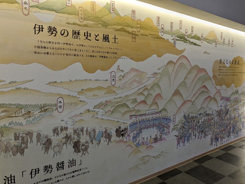 昔から伊勢神宮に日本全国から多くの人々がお参りに来て、郷土の食べ物を楽しんだこと、その要が「伊勢醬油」だったことが壁には書かれています。
