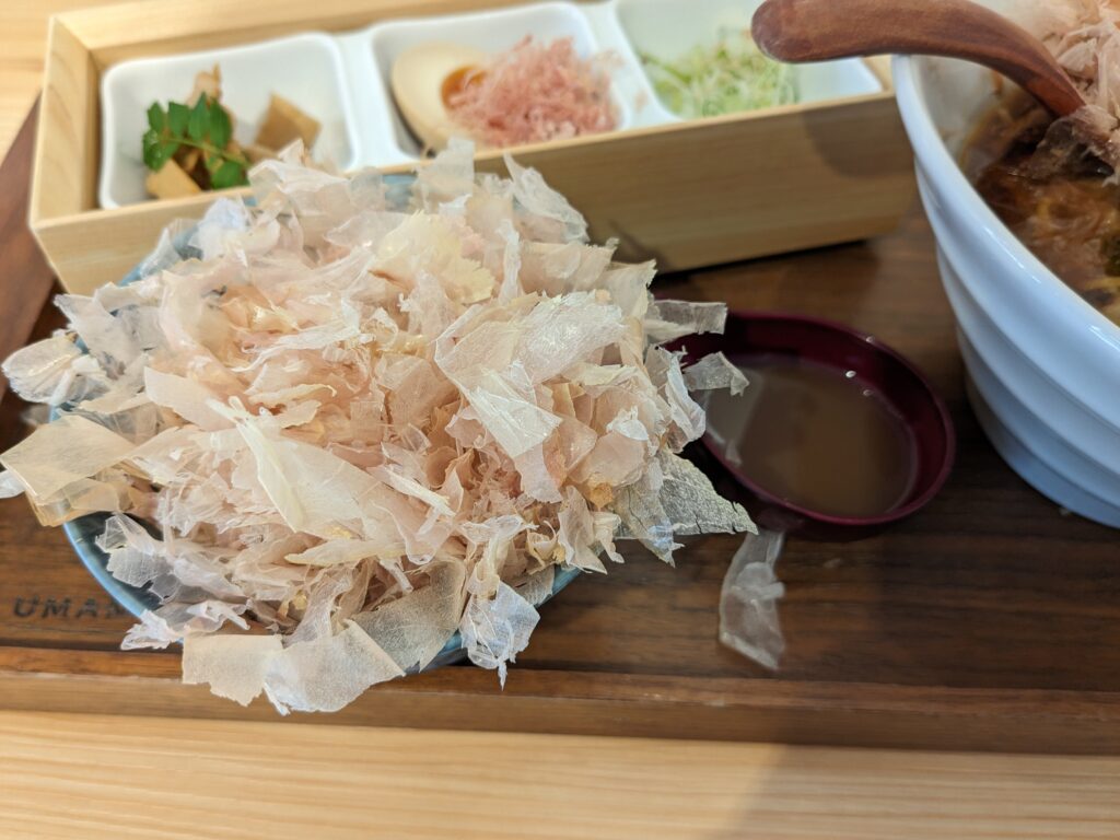 「かつおぶしと醤油のらぁ麺」は一口食べた瞬間、鰹節の旨味がこれでもかと口の中に広がります。