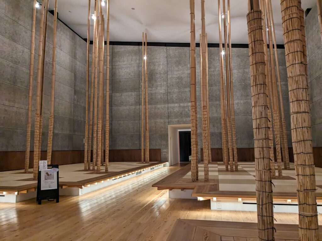 この場所は畳や竹、木、草の壁、草木染ののれんなど、自然素材に包まれている癒しの空間。