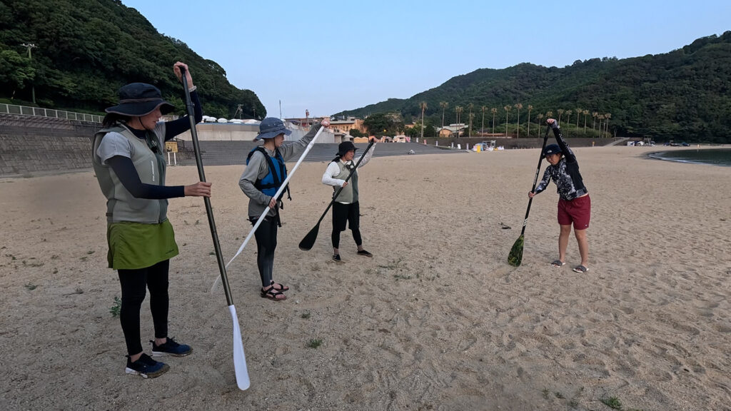 ビーチでのレクチャーでは、パドルの扱い方やSUPの操作方法を約10分間教えてもらえます。パドルの長さは自分の身長に合わせて調整できるので、初心者でも安心です。