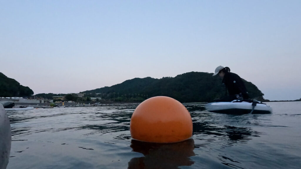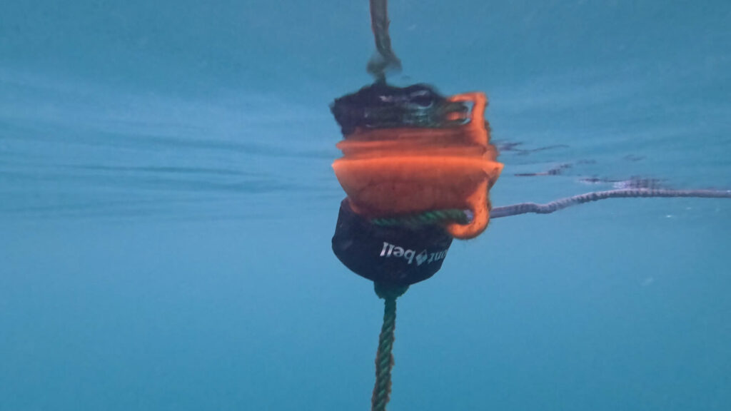 ヨガの会場に到着したらSUPに付いているリーシュコードを使って、海底に固定されたオレンジ色のブイにSUPを固定します。