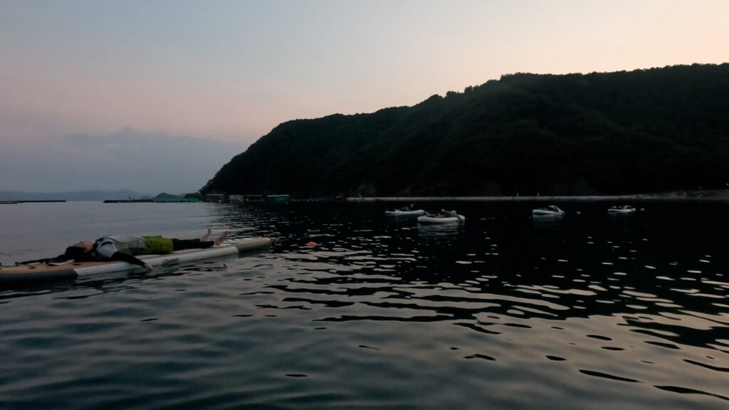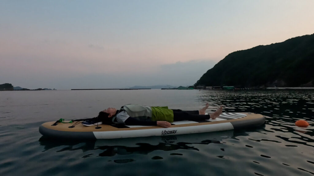 セッションの最後には、SUPの上で仰向けになり、脱力した状態で瞑想タイムを楽しみます。