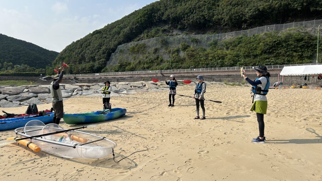 城ノ浜でのカヤック体験の始めには約5分間の初心者向けのレクチャーがあり、カヤックを前に進めるためのパドルの基本的な操作方法や海での安全注意事項を学ぶことができます。
