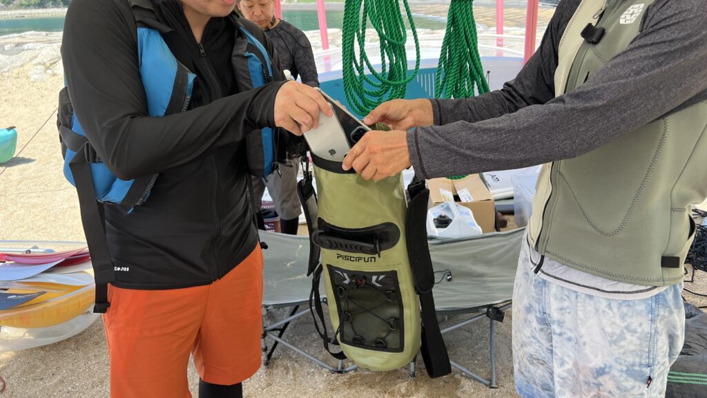 同行してくれるインストラクターが防水のリュックを持参してくれているので、水に濡れたら壊れてしまう物や城ノ浜ビーチに置いていけない貴重品は、あらかじめ預けておけば安心ですよ!
