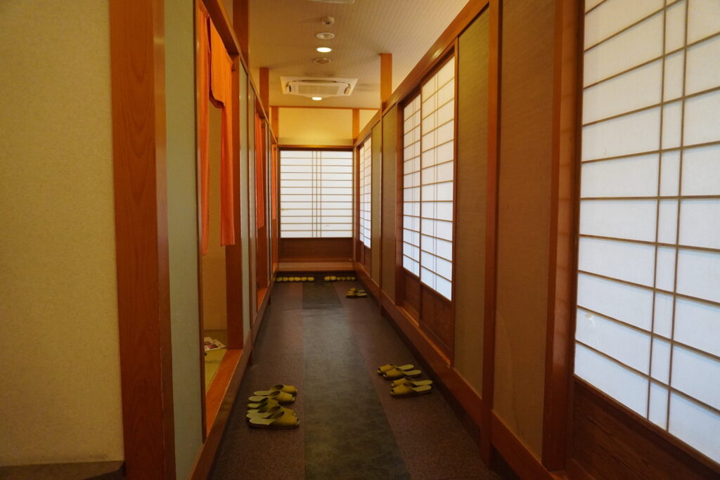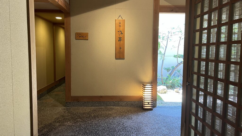 和を感じる吹き抜けの廊下を歩いて行くと、左側に貸切風呂、右側に大浴場入り口が見えてきます。