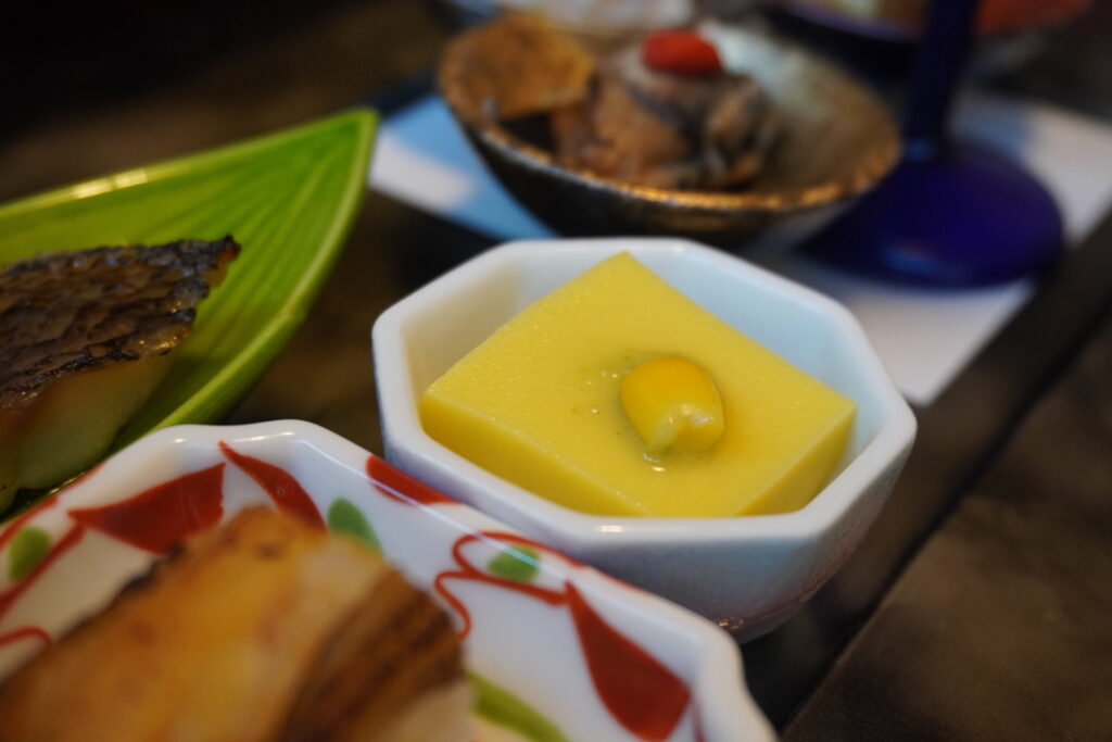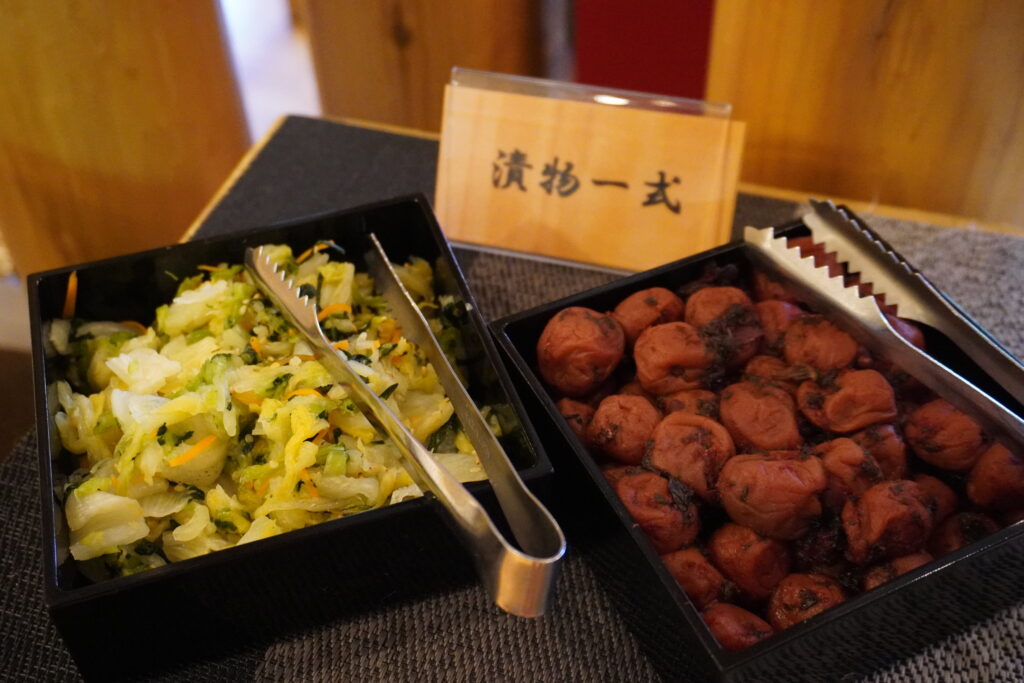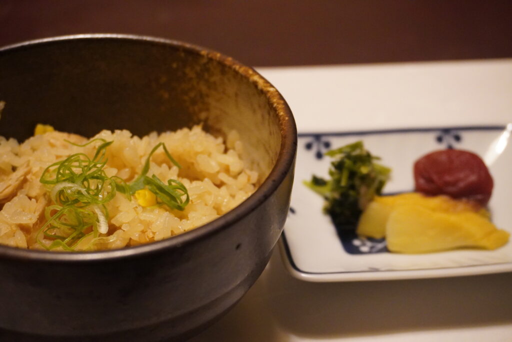 季節のご飯は夏らしく「とうもろこしごはん」でした。付いてくるお漬物と梅で味変しながら何度も楽しめます。