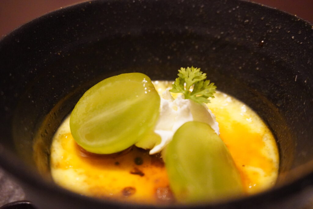季節のフルーツマスカットが乗ったプリン。最後にさっぱりと美味しくいただきました!