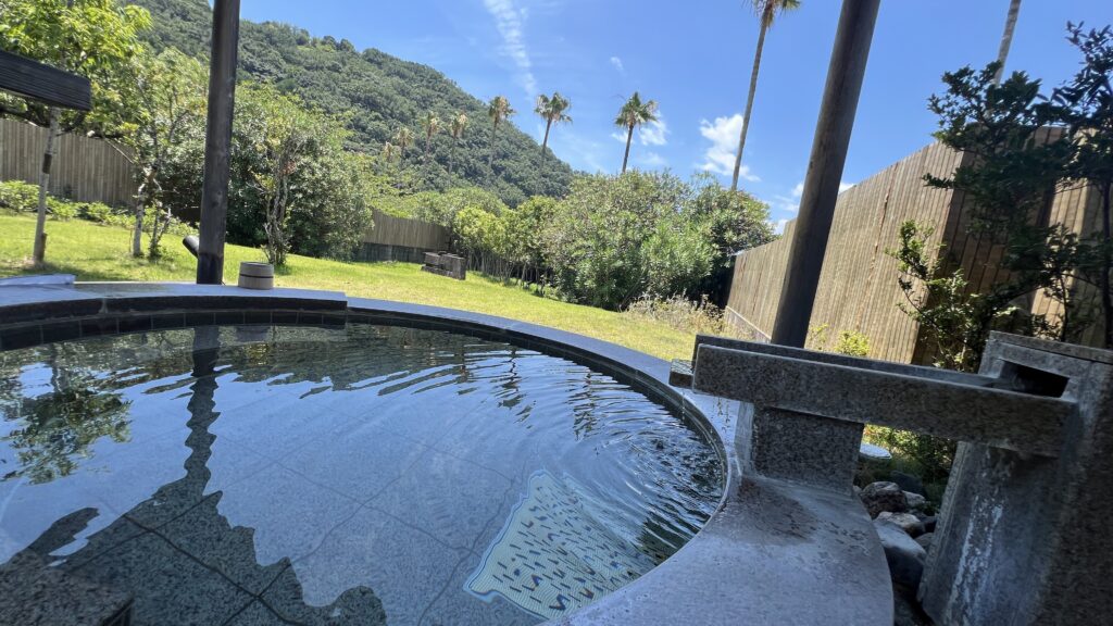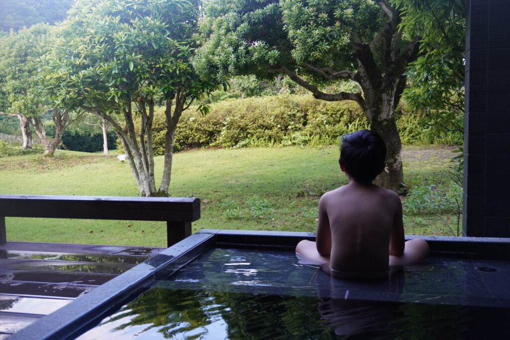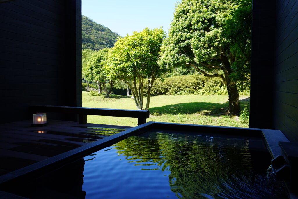 昼間に入ると緑が色濃く見える庭、夜に入ると満天の夜空を眺めることができるので、同じ露天風呂でも時間によって2度も楽しめます!