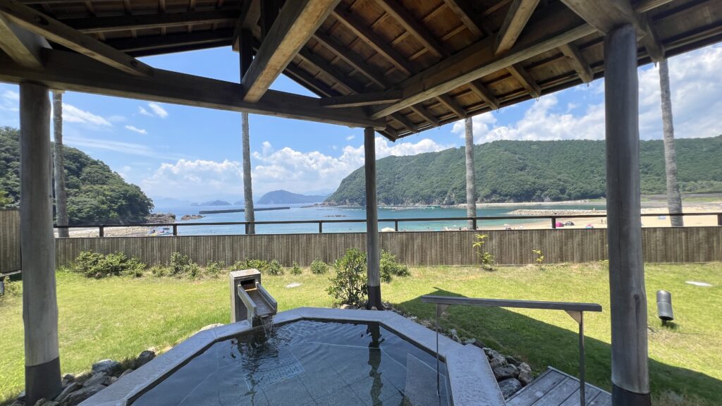 2015年にリニューアルした季の座の温泉施設「沐亭(もくてい)」は、きれいで見晴らしが良く、波音を聴きながら入る露天風呂は最高の癒し時間です。
