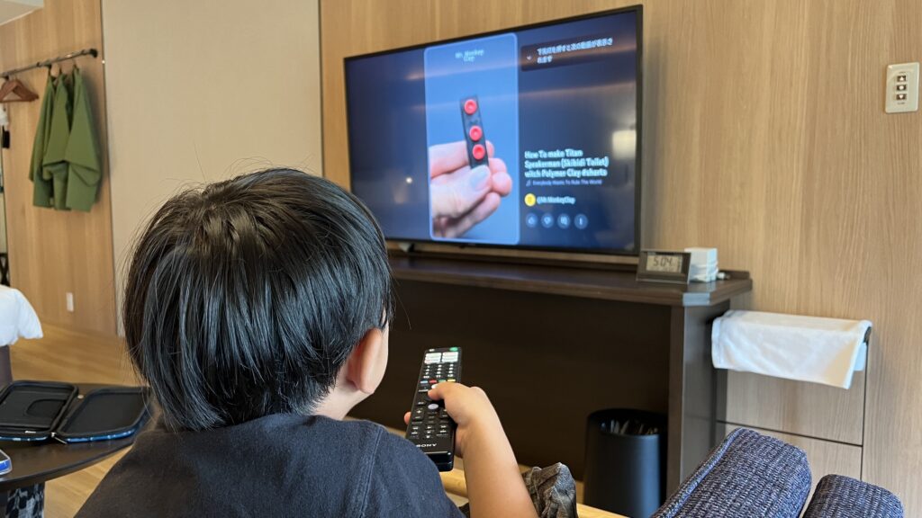 YouTube見たい子どもにとっては最高のテレビが部屋にはあります!大人のスマホを取られることもないのでかなりありがたいポイントでした。
