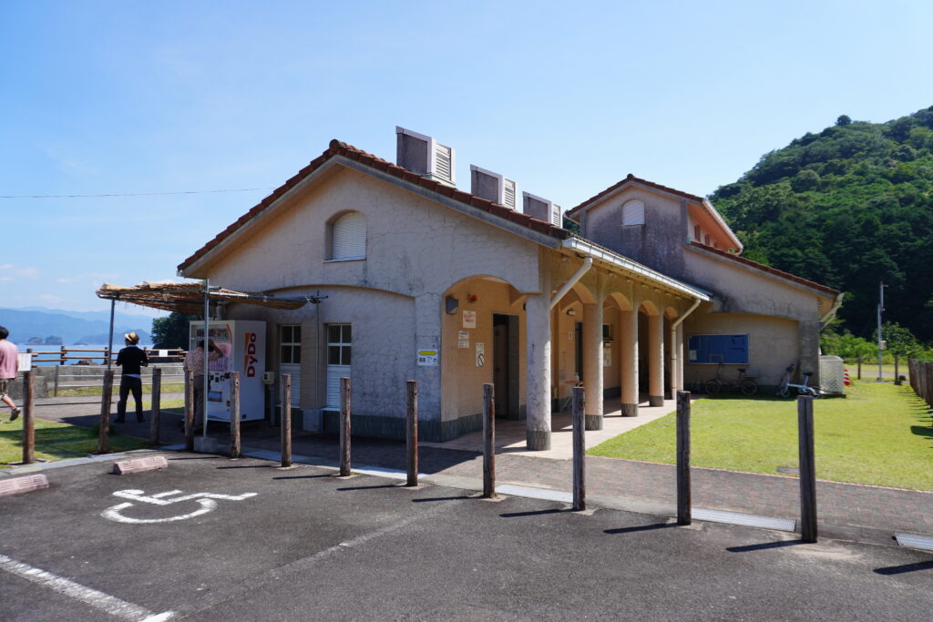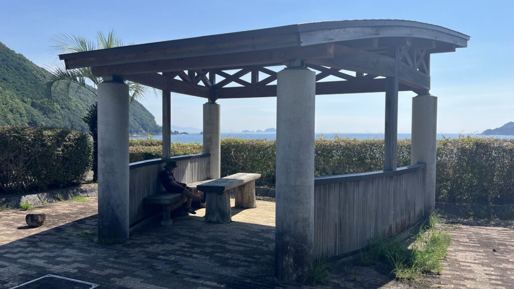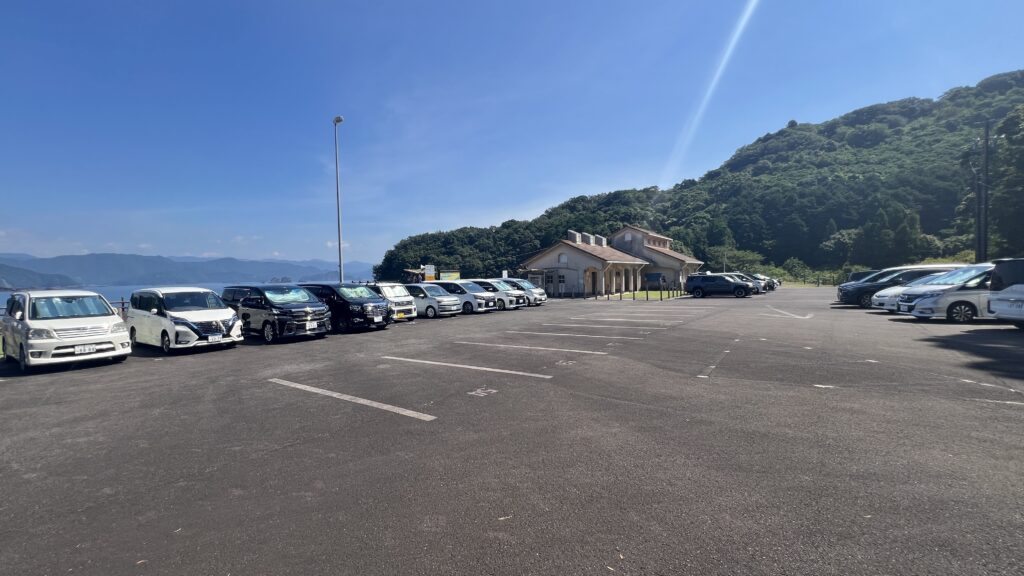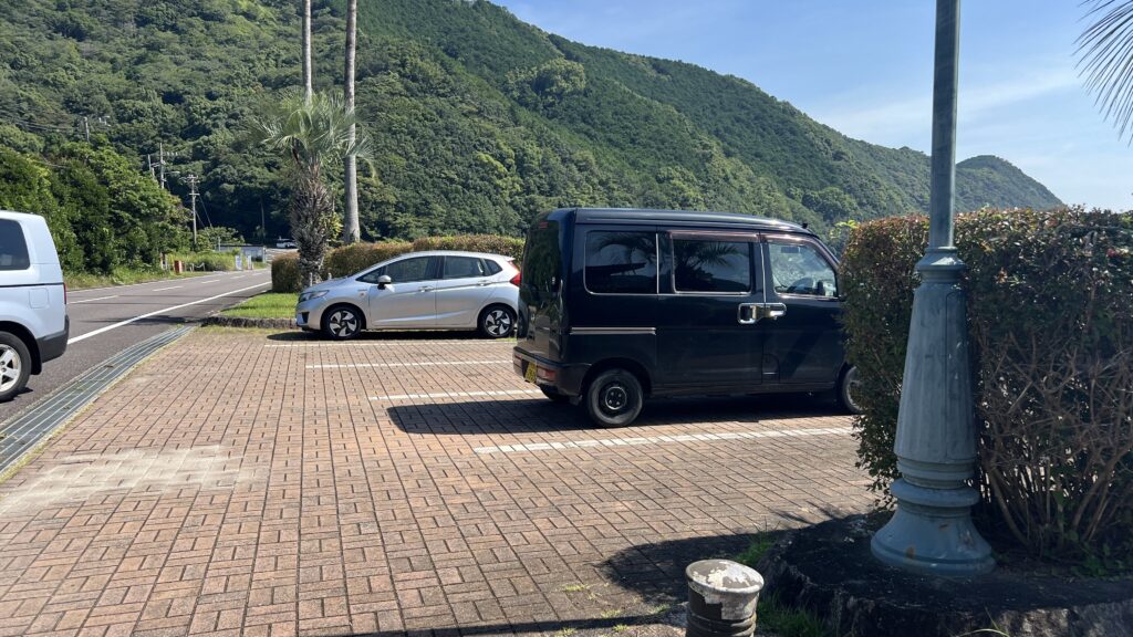 トンネルを抜けて進むと左側に船越海岸が現れます。駐車場とトイレ・シャワー、休憩スポットがあるので、休憩にはベストな場所です。
