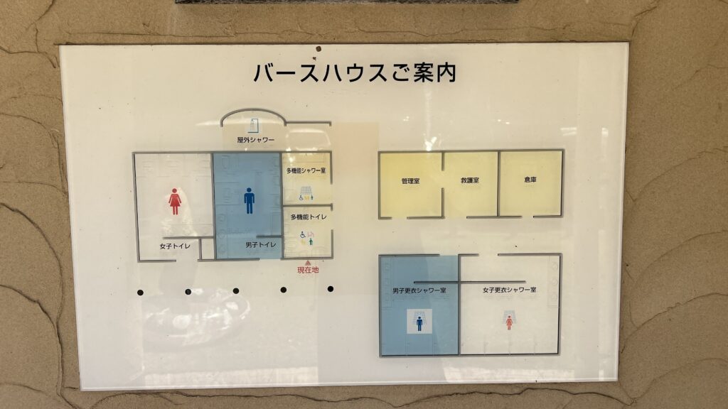 トイレ・シャワー・更衣室・レンタル窓口・救護室は、こちらのバースハウスにあります。