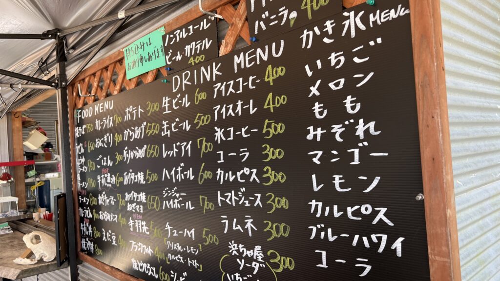 海でたくさん遊んでお腹が空いた人にはがっつりカレーライスなどのご飯もの、ちょっと暑さで食欲がない方には冷たいかき氷などの冷んやりメニューがおすすめですよ。