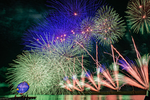 「彩雲孔雀(さいうんくじゃく)」を含め、約3,000発の花火を「目・鼻・耳」全てで楽しむことができる大迫力の花火大会となっています。