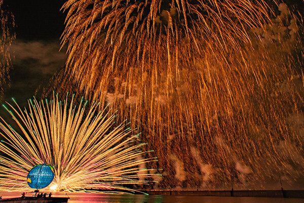 しかも、花火の色は海面にも映り込むので、夜空だけでなく視界全体を花火の彩りが埋め尽くします。