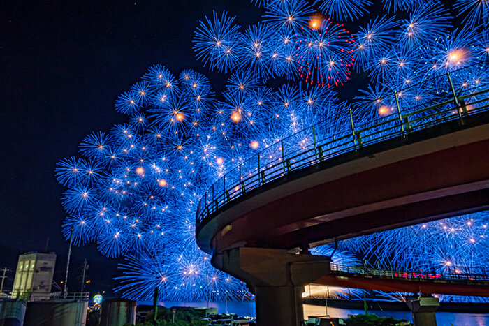 というのも、花火の打ち上げ場所である堤防の折れ曲がった地形を利用して、虹を描くように花火を打ち上げているからです。