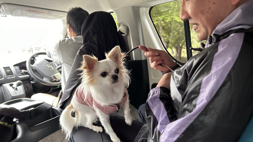 ワンちゃんはケージではなく飼い主さんの膝上もしくは足元で乗車します。
