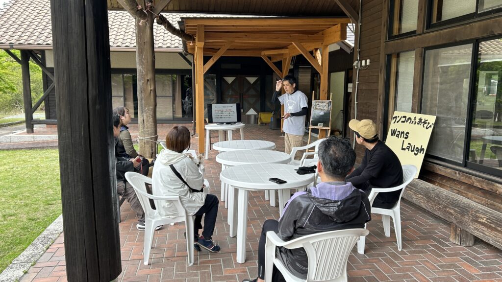 このテラスで受付をしてから、森遊びの注意事項や説明を聞きます。