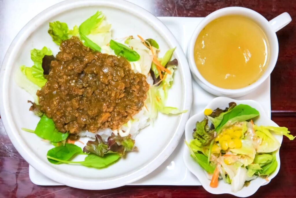 ランチタイムに食べられるのはロコモコ丼やキーマカレー、ドリアなどのカフェごはんです。プラス250円でドリンクセットに、プラス550円でデザートセットに変更できます。