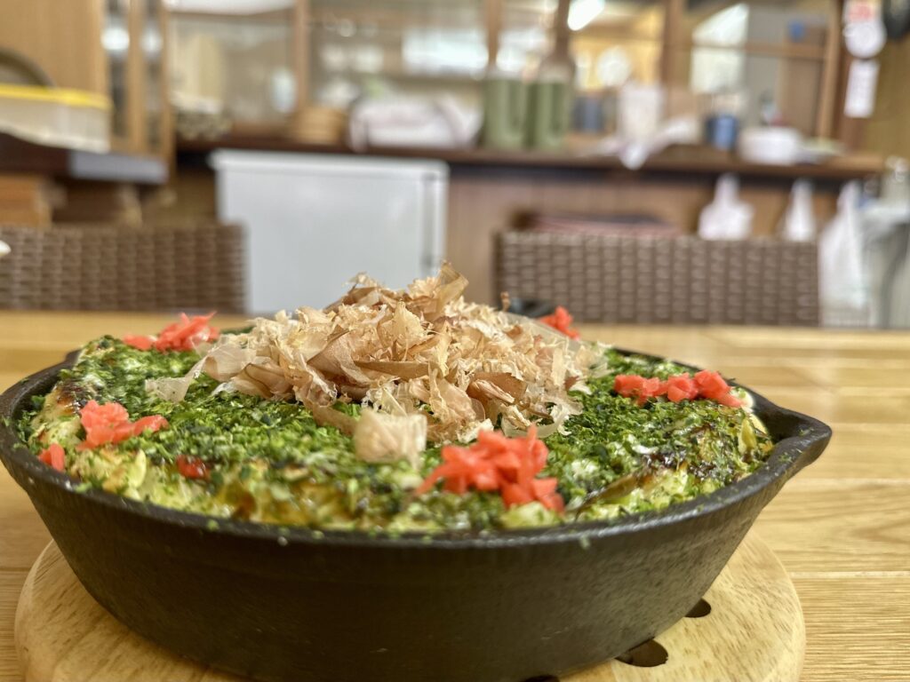 メニューはお好み焼き、たこ焼き、焼きそば、たい焼きの4種類で、中でも人気なのが山芋を使ったふわふわのお好み焼きです。かわいいスキレットに乗って出てくるので思わず写真を撮りたくなります。お好み焼きはアツアツで最高ですが、やけどにはご注意を!筆者が食べたときは美味しすぎて急いでしまい、口の中をやけどしてしまいました…。