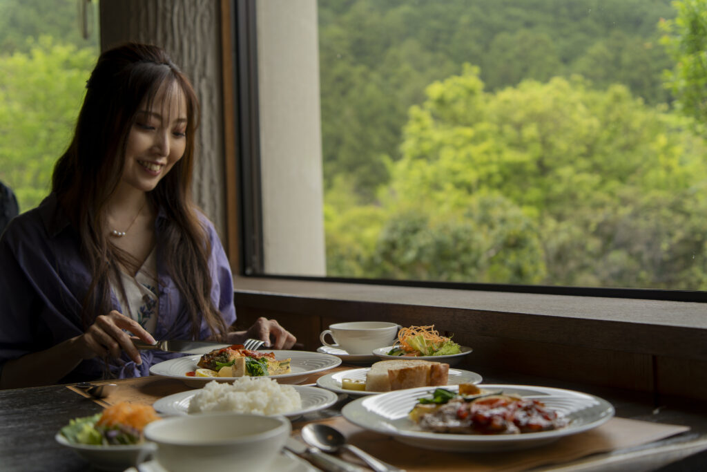 外の景色を見渡せる180°パノラマビューのレストランでいただく美味しいランチは、優雅な気持ちでリラックスできますよ。筆者も毎月通っているお気に入りのレストランです。食事のあとは敷地内に広がる自然の中を散策したり、天然温泉に入ったりと一日たっぷり癒されます。