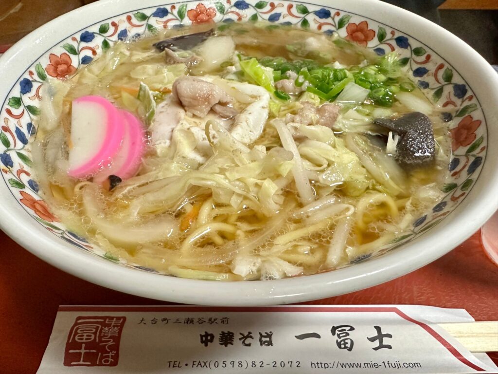 県内外にファンを持つ一冨士ファンのお目当ては「中華そば」と「ちゃんぽん」です。あっさりしていてコクのある和風しょうゆベースのスープが一番人気。黄金に輝くスープには大台町を流れる清流「宮川」の水が使われ、紀州の海産物から出汁をたっぷりとひいています。1975年の創業以来変わらぬ味でリピーターが絶えません。