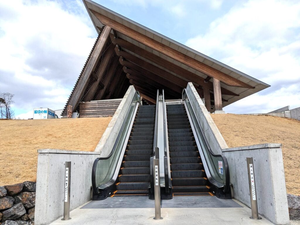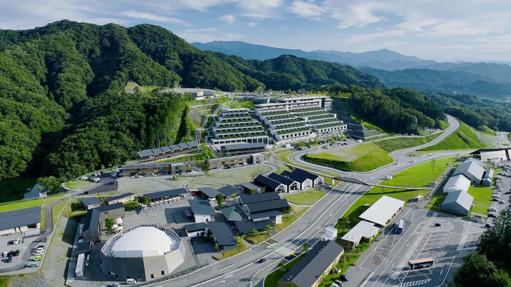 ・山の地形に沿って自然の中に建物や駐車場を分散させ、一つの村であるようにつくられた大きな施設
