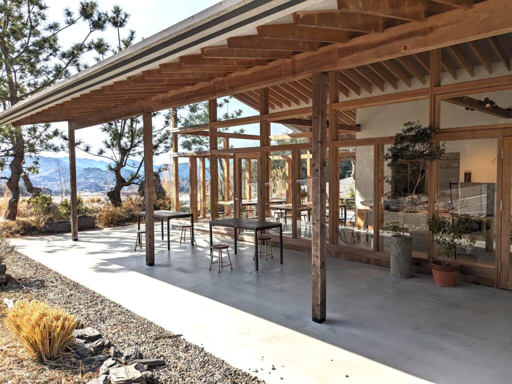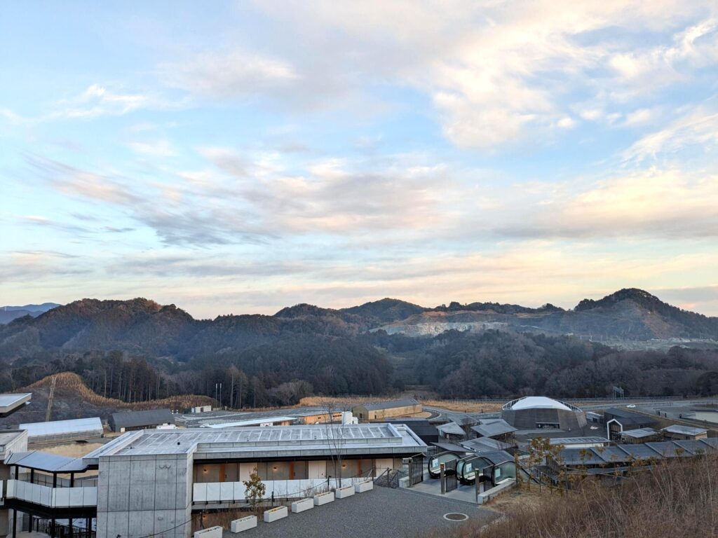 夕暮れ時の三重の山々を、農園エリアにあるNOUNIYELL(ノウニエール)でオーガニックコーヒーと共に楽しむこともできます。ただ、昼の部は15時に終了で、夜は17時から開店なのでそこだけはご注意ください。
