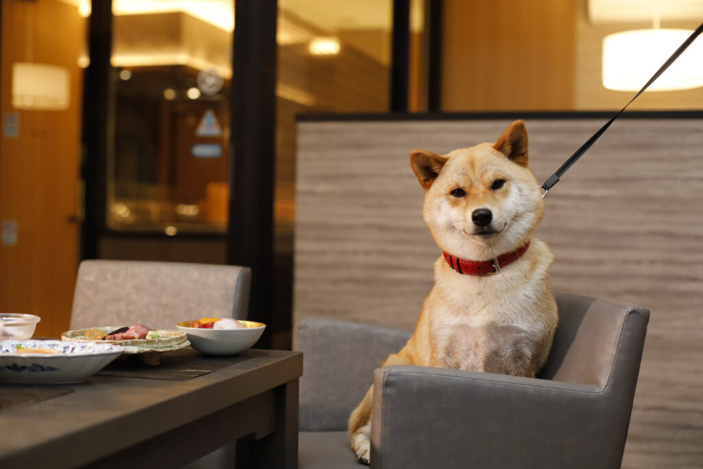 夕食はVillaお伽噺の敷地内のダイニングHIBAへ。 ワンちゃん専用の椅子やカートも使えるので、ワンちゃんと同じ目線で美味しいお食事を楽しめます。 ワンちゃんごはんも準備中だそうです。