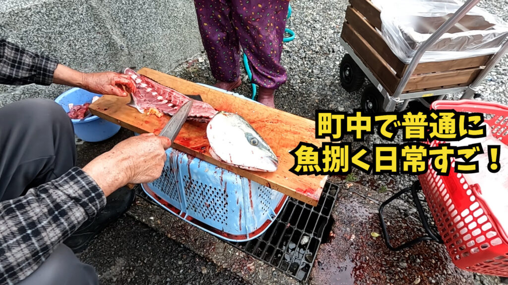家の前で大きなブリを手際よく捌くおじいちゃんとそれを眺めるおばあちゃん達。よそから見たらどんな状況?!という感じですが、これが漁師町の日常的な光景です。獲れたての美味しいブリがすぐに手に入り、丸ごと堪能できるなんて最高ですよね。
