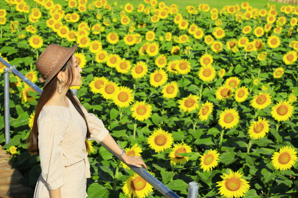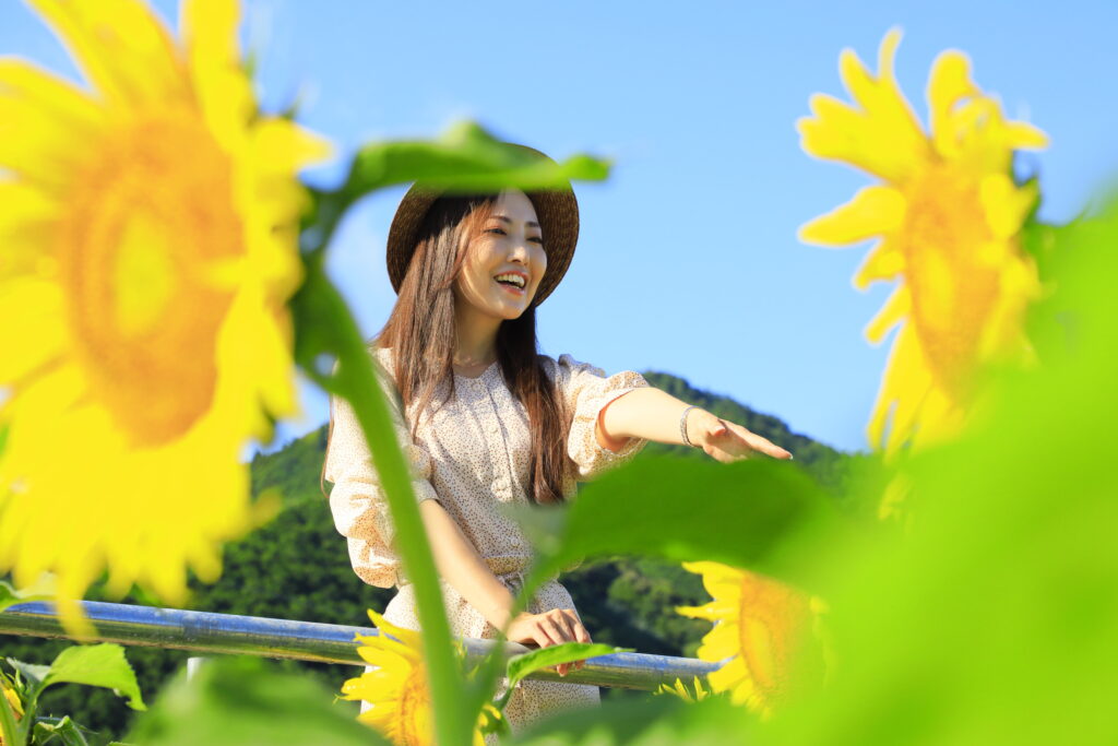 三重県多気郡大台町弥起井にある大台町B&G海洋センター(奥伊勢湖漕艇場)前の向日葵が満開です!大台町観光アンバサダー・キャスターマミが地元写真家と一緒に楽しんできました♪