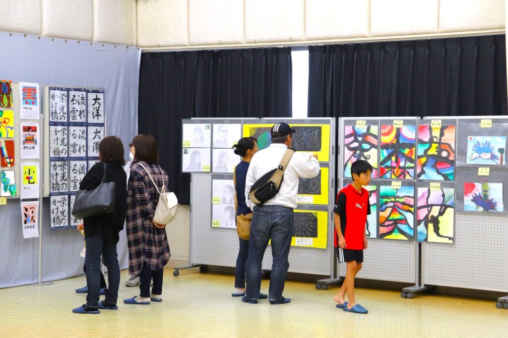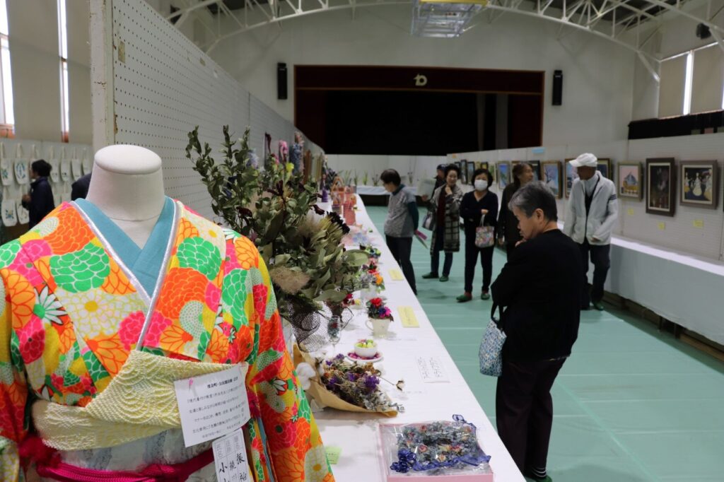 町民体育館と中央公民館では作品展を開催!パネル一面を飾るパッチワーク、絵画、生け花、着付けの展示など、さまざまなジャンルの作品を鑑賞することができます。