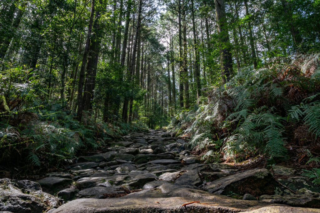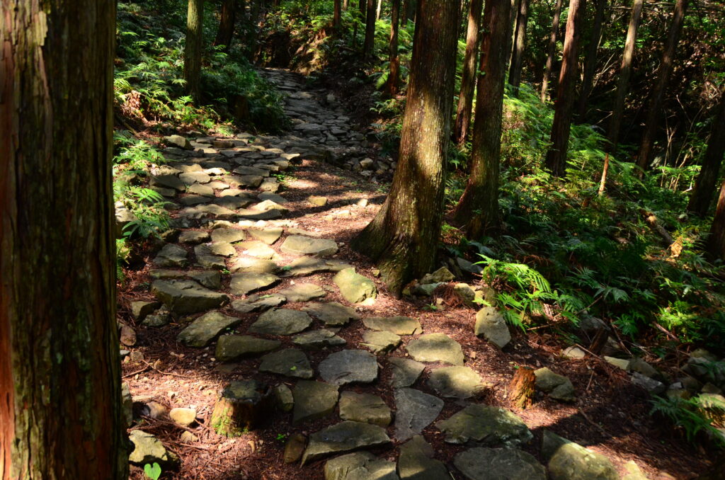 【馬越峠(まごせ)】 「馬越峠」は、世界遺産・熊野古道の中でも随一の美しさを誇る石畳と、尾鷲ヒノキ林が広がる有名なスポットです。 重厚な自然石が折り重なるように敷き詰められた石畳は、日本でもトップクラスの雨量を誇る尾鷲の雨から道を守ってきました。