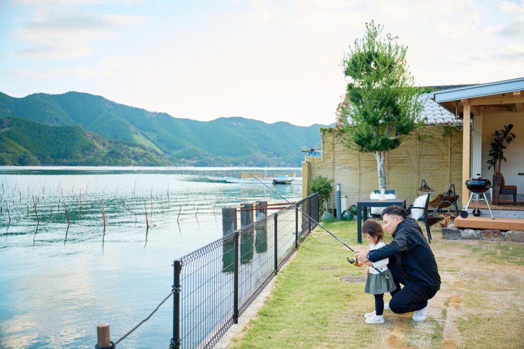 釣りセットを貸し出ししているので、お庭から釣り体験ができます。