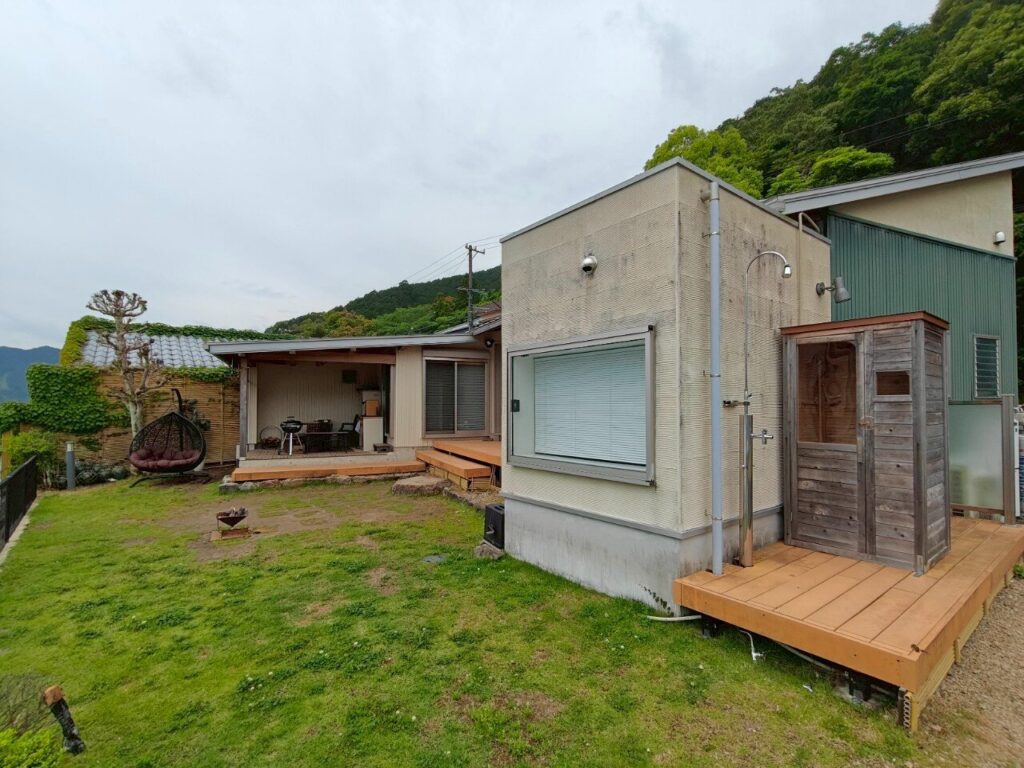 目の前は波の穏やかな内海、後ろは山の自然豊かで静かな場所に建つ「窮楽通楽」。