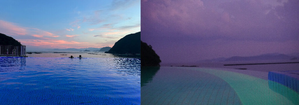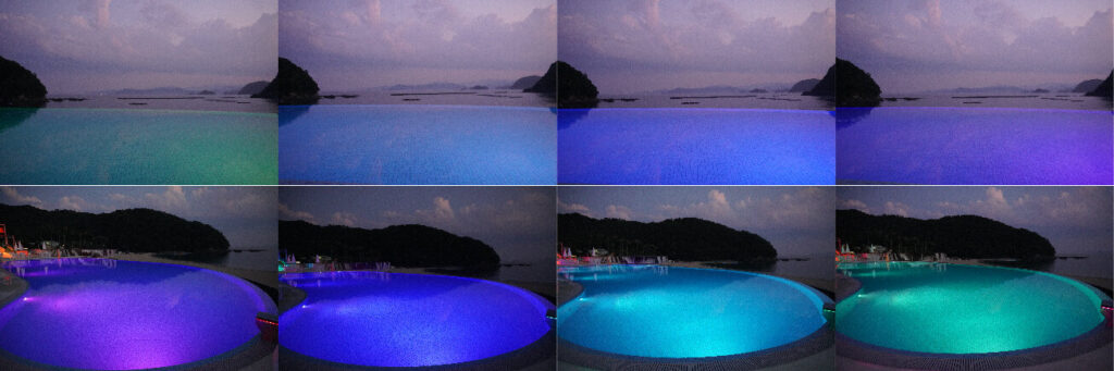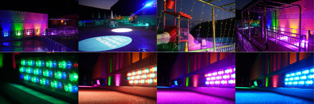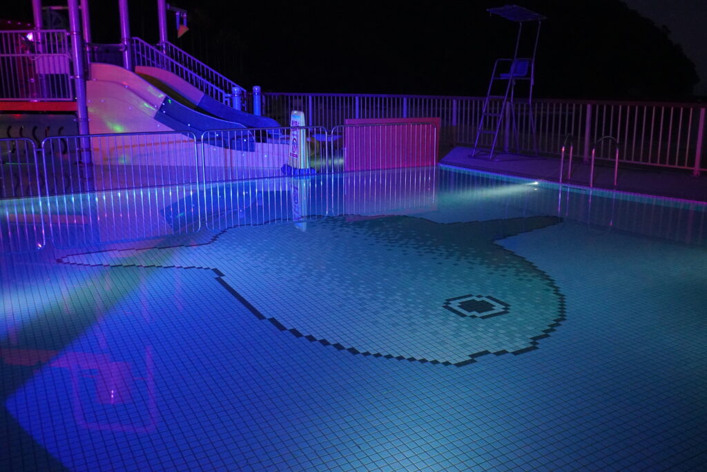 ・プールの色がライトアップによって移り変わるので、色んな雰囲気のプールを楽しめる。