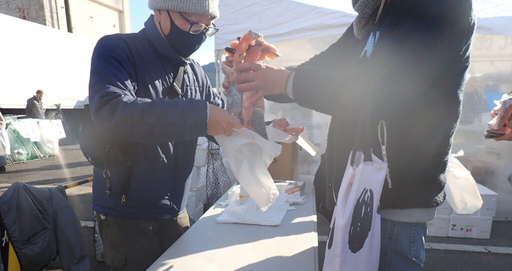 お客さんたちは、ビニール袋にどうすれば鮭をたくさん詰められるか、横向きにしたり縦向きにしたりと工夫を凝らします。