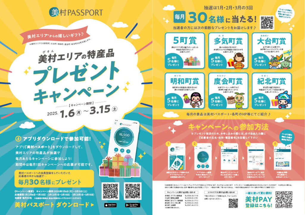 2025年1月6日(月)から3月15日(土)までの期間、美村エリアの特産品が抽選で当たる「美村エリア特産品プレゼントキャンペーン」が開催しました!