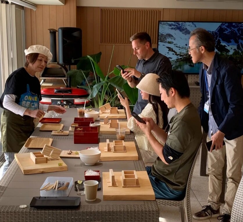 紀北町の城ノ浜ビーチで行われる体験型観光コンテンツ 地元のお母さんから教わった伝統的な押し寿司体験 その日採れた地元の魚を食せます。 紀伊の檜の木箱を使って押し寿司を作成、その場で味わえる 木箱はお土産として持ち帰り可能 地元の加藤シイタケさんの新鮮な採りたて菌床椎茸も炭火焼きで味わえます