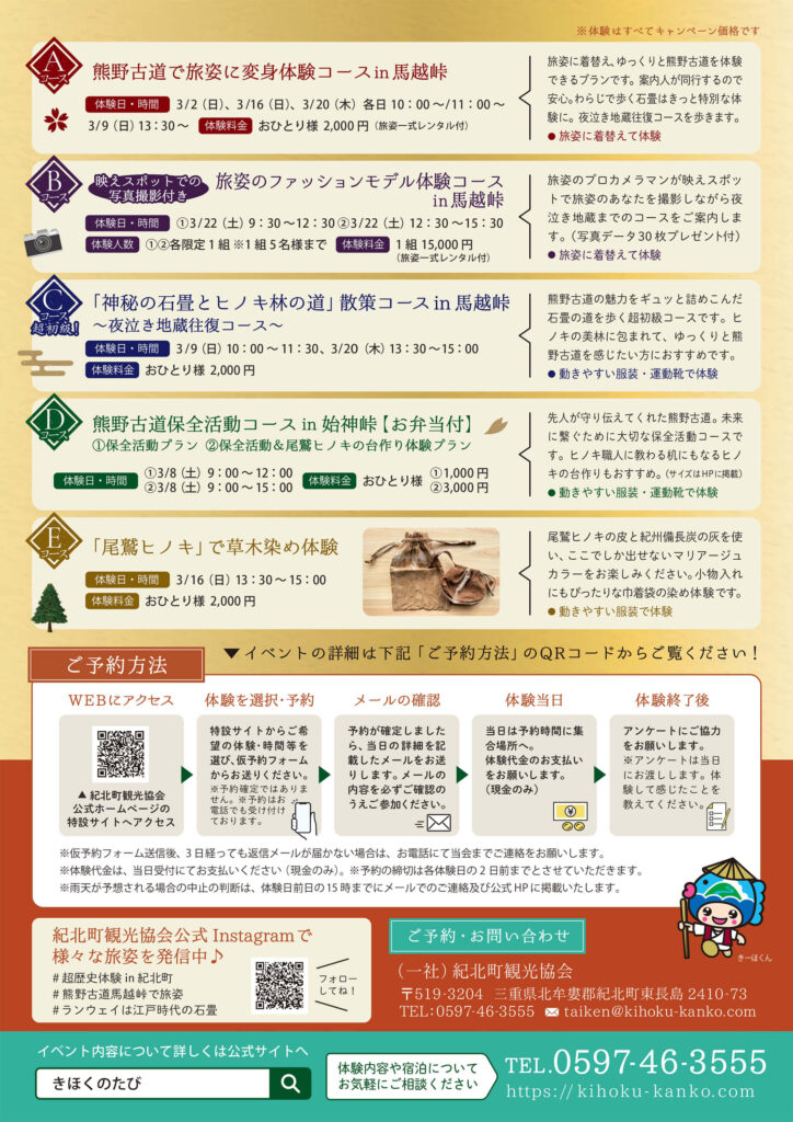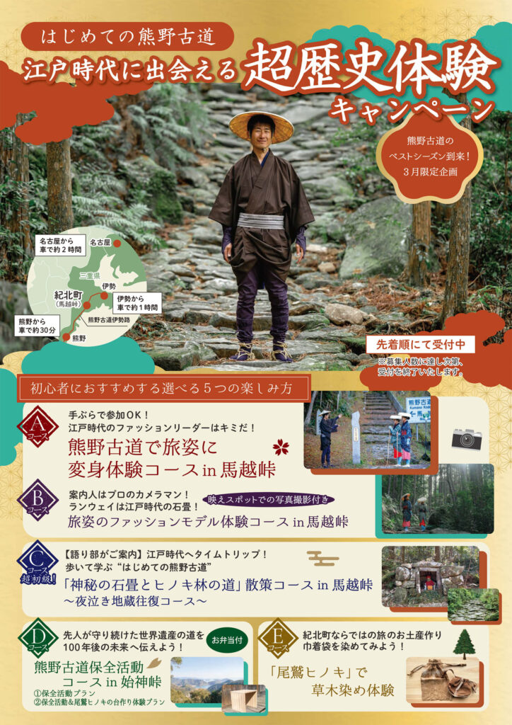 3月は暖かくなってきて、熊野古道歩きにおすすめの季節です。江戸時代の衣装を着て世界遺産の石畳の道を歩いてみませんか?紀北町観光協会から「江戸時代に出会える超歴史体験」ツアーが販売中です。 A~Eの5つのコースがあり、各コースとも前日15時まで申込可能です。Aコース 熊野古道で旅姿変身体験コースin馬越峠 3/9(日)、3/16(日)、3/20(木) ※夜泣き地蔵折り返し Bコース 旅姿のファッションモデル体験コースin馬越峠 3/22㈯ ※夜泣き地蔵折り返し Cコース 「神秘の石畳とヒノキ林の道」散策コースin馬越峠 3/9(日)、3/20(木) ※夜泣き地蔵折り返し Dコース 熊野古道保全活動コースin始神峠【お弁当付】 3/8㈯ ※尾鷲ヒノキの台作り体験付きプラン有 Eコース 「尾鷲ヒノキ」で草木染め体験 3/16(日) 料金など詳細は下記URLからご確認下さい。 https://kihoku-kanko.com/2025rekishitaiken/