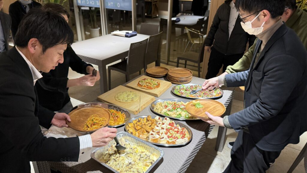 交流会では、ON THE BEACH Cafeさんの美味しいお料理をビュッフェ形式で楽しみながら、各自自由に交流を深めました。