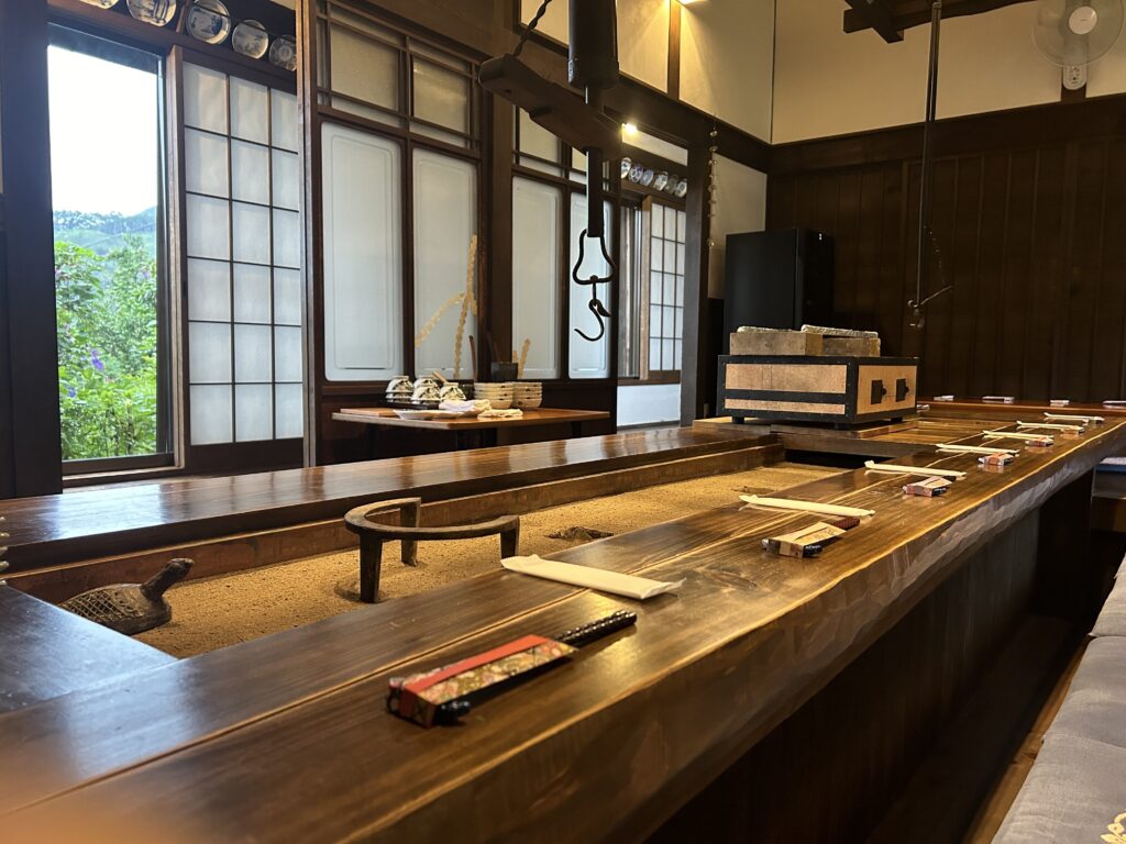 囲炉裏や七輪を囲んだ掘りごたつ席で、地元の新鮮な魚や肉などを目の前で調理する贅沢な体験ができます。