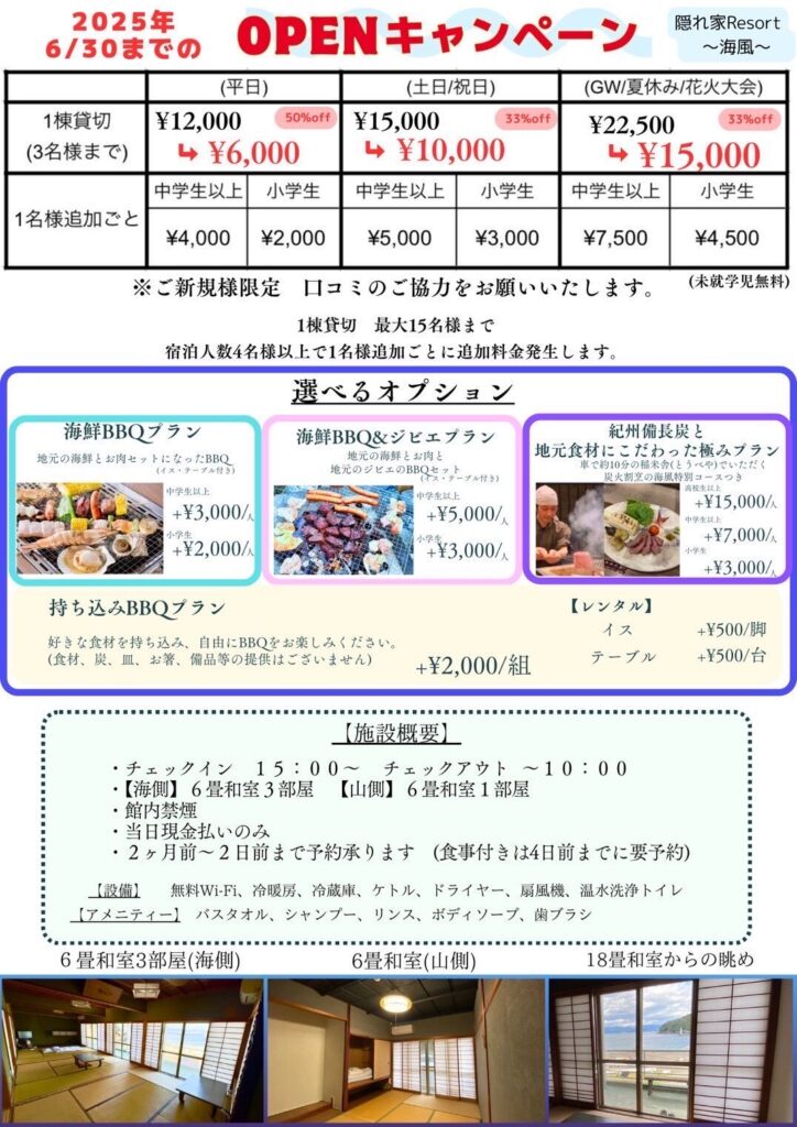 紀北町に新しく仲間入りした宿泊施設「海風」の見どころは以下の通りです。