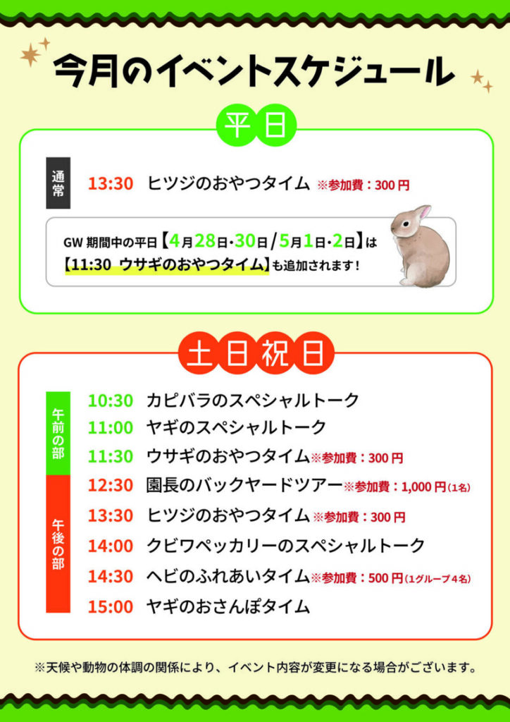 午前の部はカピバラとヤギの飼育員さんスペシャルトーク、参加型のウサギのおやつタイム。午後の部は、園長のバックヤードツアーにヒツジのおやつタイム、クビワペッカリーのスペシャルトーク、ヘビのふれあいタイム、ヤギのおさんぽタイム。